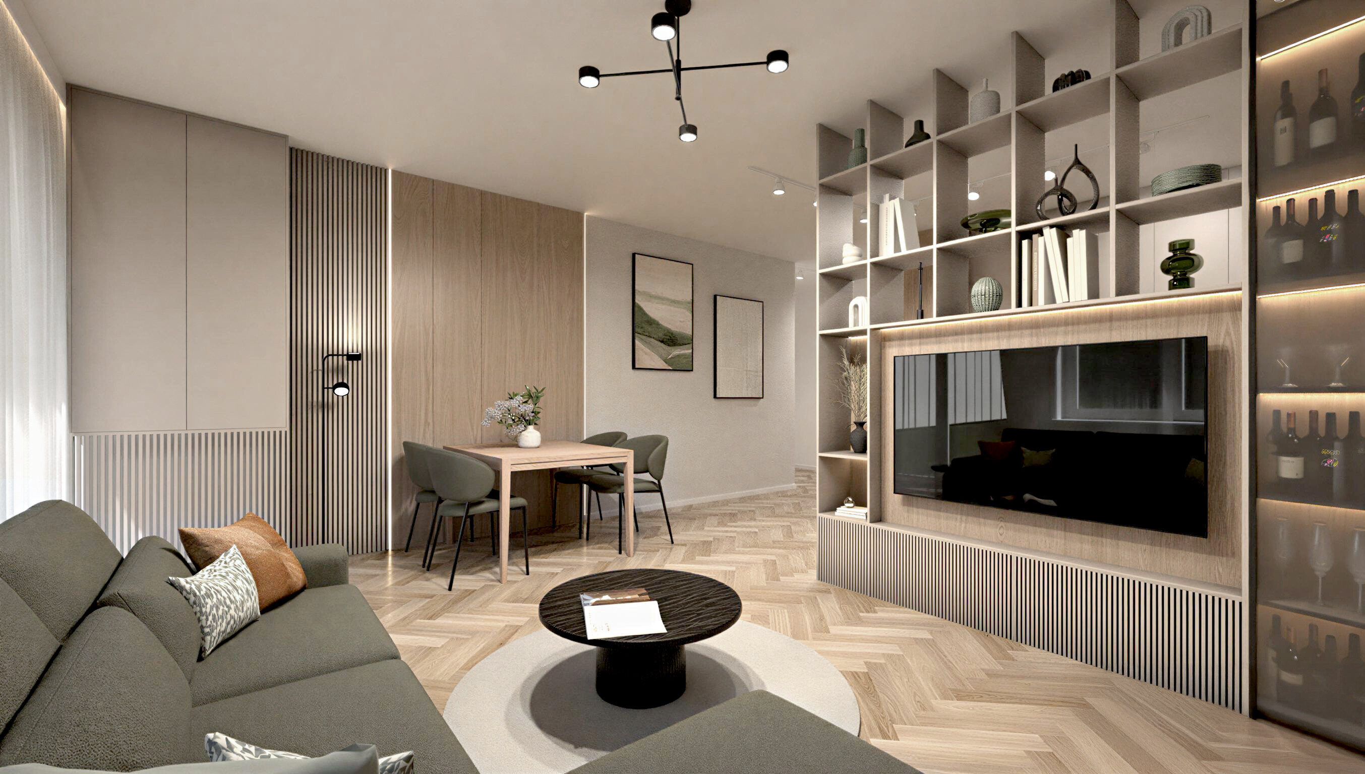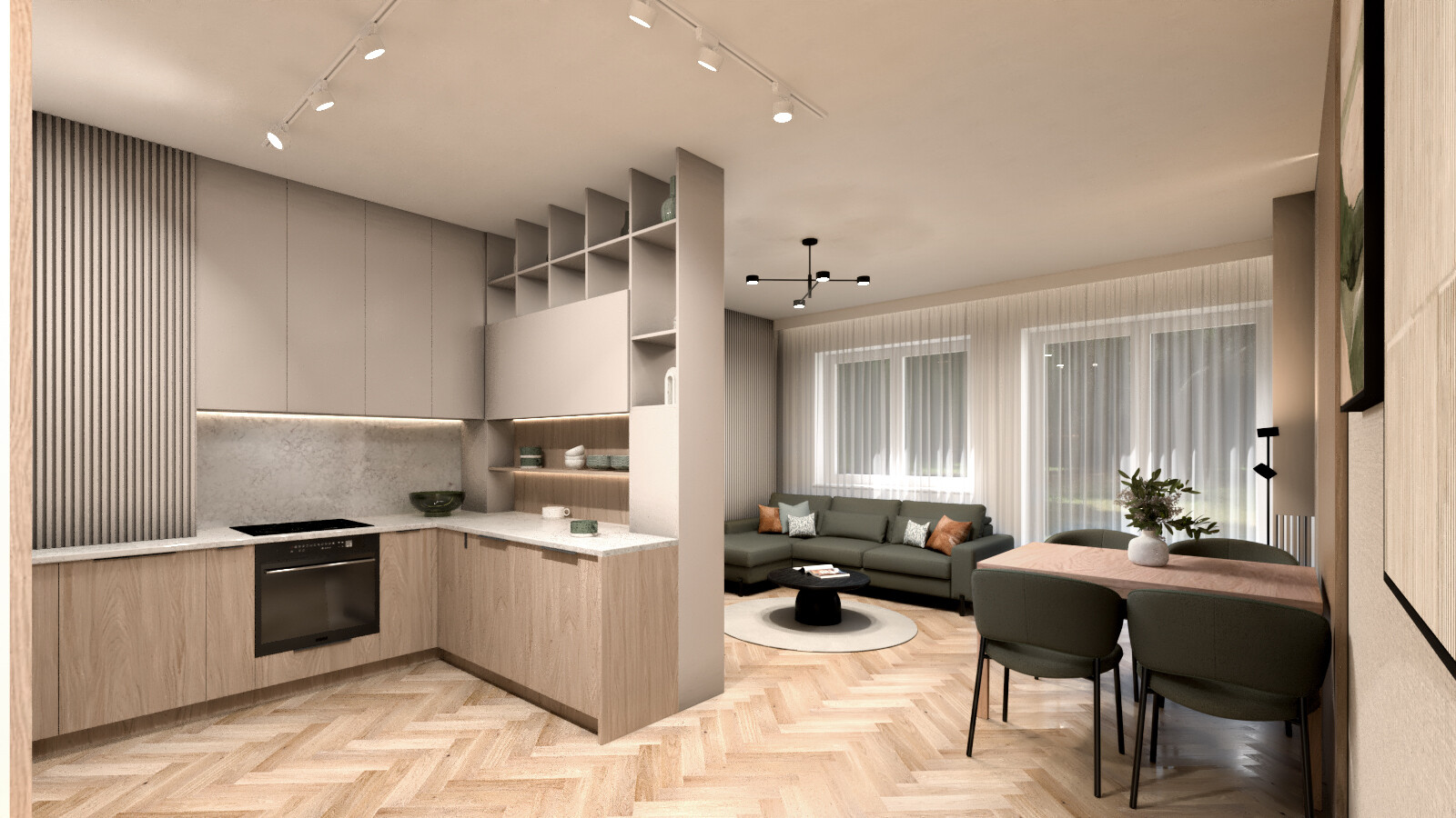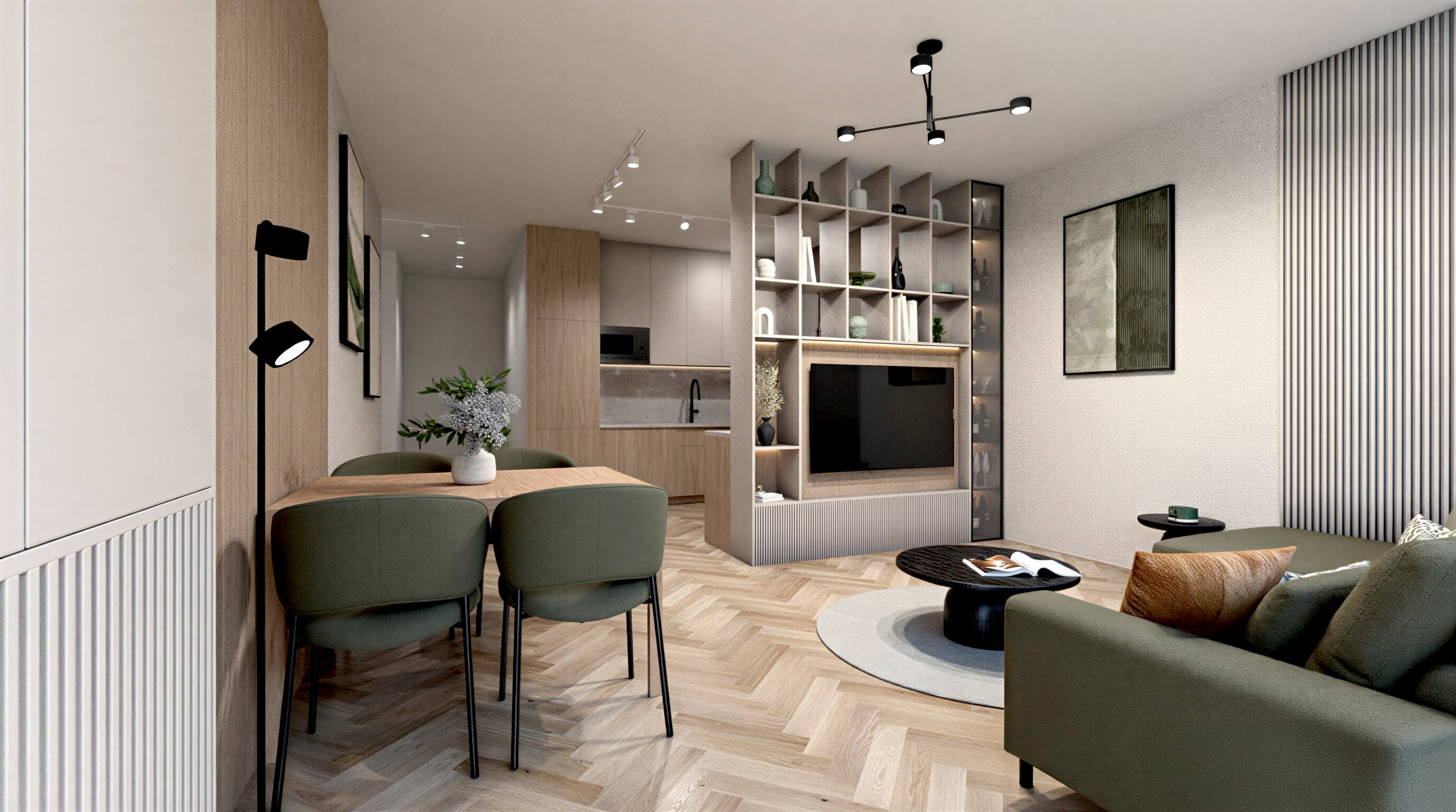 Nowoczesna strefa dzienna utrzymana w stonowanej, eleganckiej kolorystyce. Wnętrze łączy funkcjonalność z przytulnym klimatem – ciepłe drewno, jasne beże i akcenty zieleni tworzą spójną, harmonijną całość. Centralnym punktem salonu jest wygodna sofa i zabudowa RTV z dekoracyjnymi półkami, a jadalnia z prostym stołem i miękkimi krzesłami płynnie łączy się z kuchnią. Subtelne oświetlenie i minimalistyczne dodatki dopełniają aranżacji, podkreślając nowoczesny charakter mieszkania.
