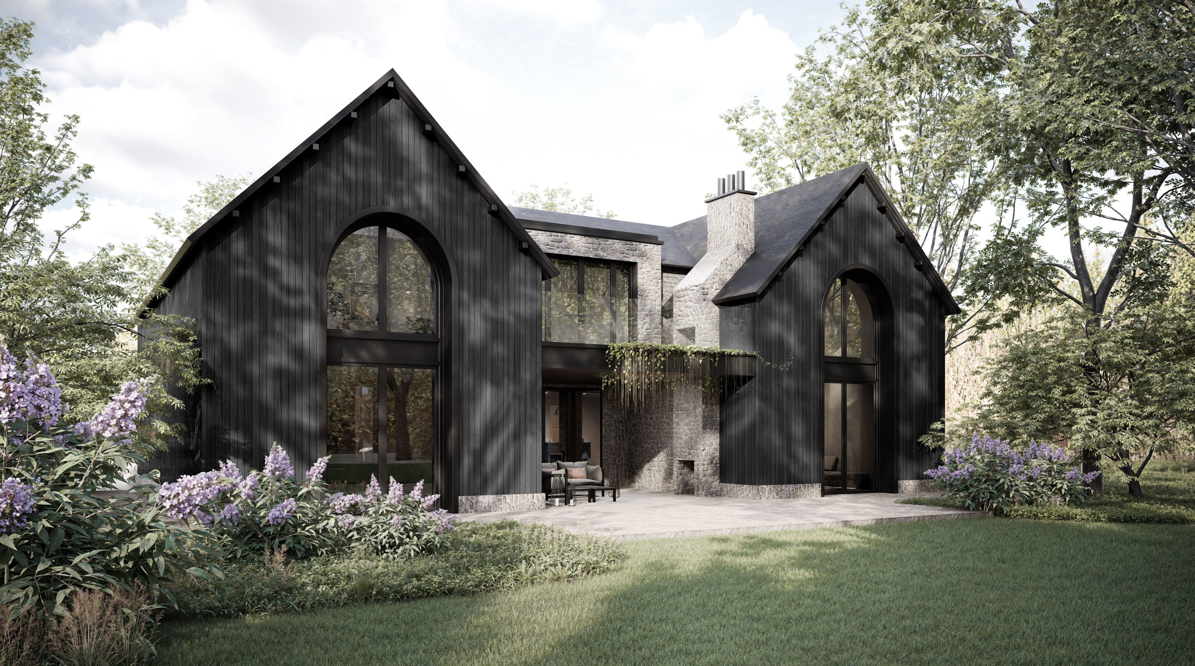 Dom składa się z dwóch wyraźnych, szczytowych skrzydeł połączonych kamiennym, cofniętym łącznikiem, który porządkuje kompozycję i nadaje jej odpowiednią skalę. Ciemna, pionowa okładzina drewniana oraz naturalny kamień sprawiają, że bryła — mimo swoich gabarytów — nie dominuje nad otoczeniem, lecz stapia się z leśnym krajobrazem. Duże, łukowe przeszklenia w szczytach nadają całości szlachetny, niemal rezydencjonalny charakter, jednocześnie otwierając wnętrza na zieleń i światło.