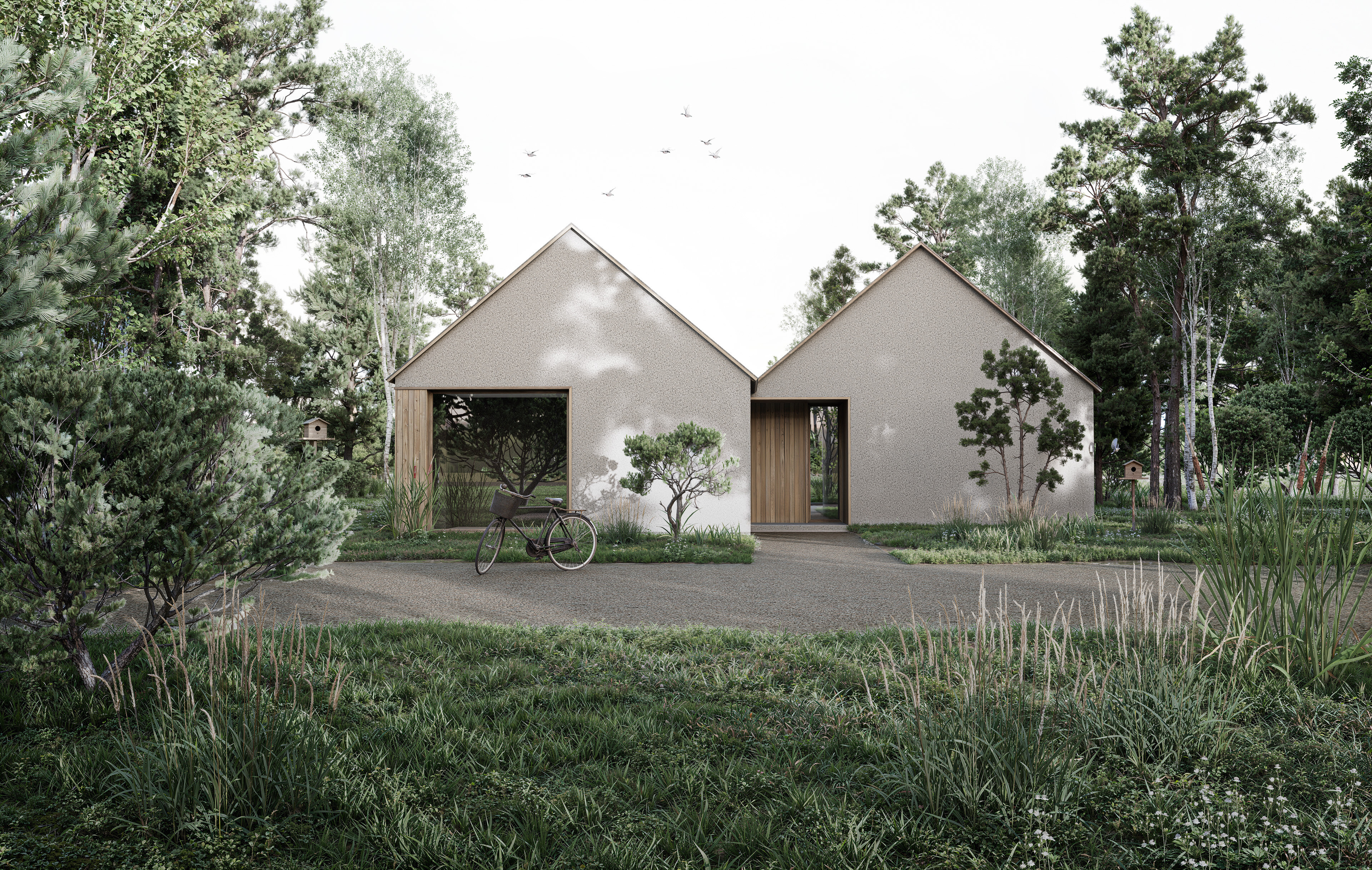 Ograniczona paleta materiałów oraz proste, archetypiczne formy podkreślają spokój i czytelność kompozycji.