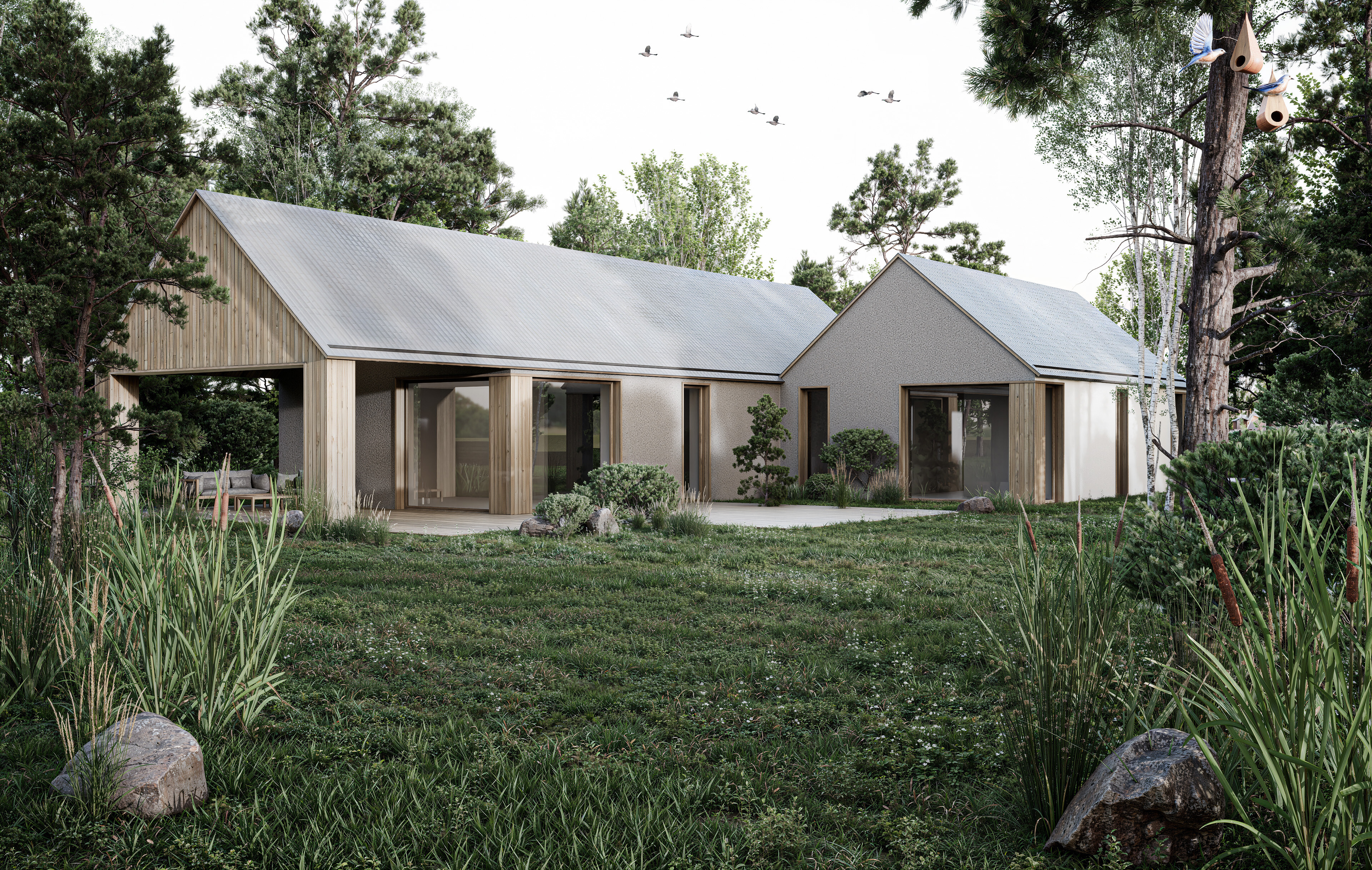 Dom, który się nie narzuca. Ledwie unosi się ponad naturalny poziom terenu, pozwalając krajobrazowi swobodnie przenikać jego bryłę i oswajać architekturę. Zamiast dominować — współistnieje.Szorstki tynk drapany, miękko falująca linia dachu i surowe drewniane detale budują jego powściągliwy charakter.