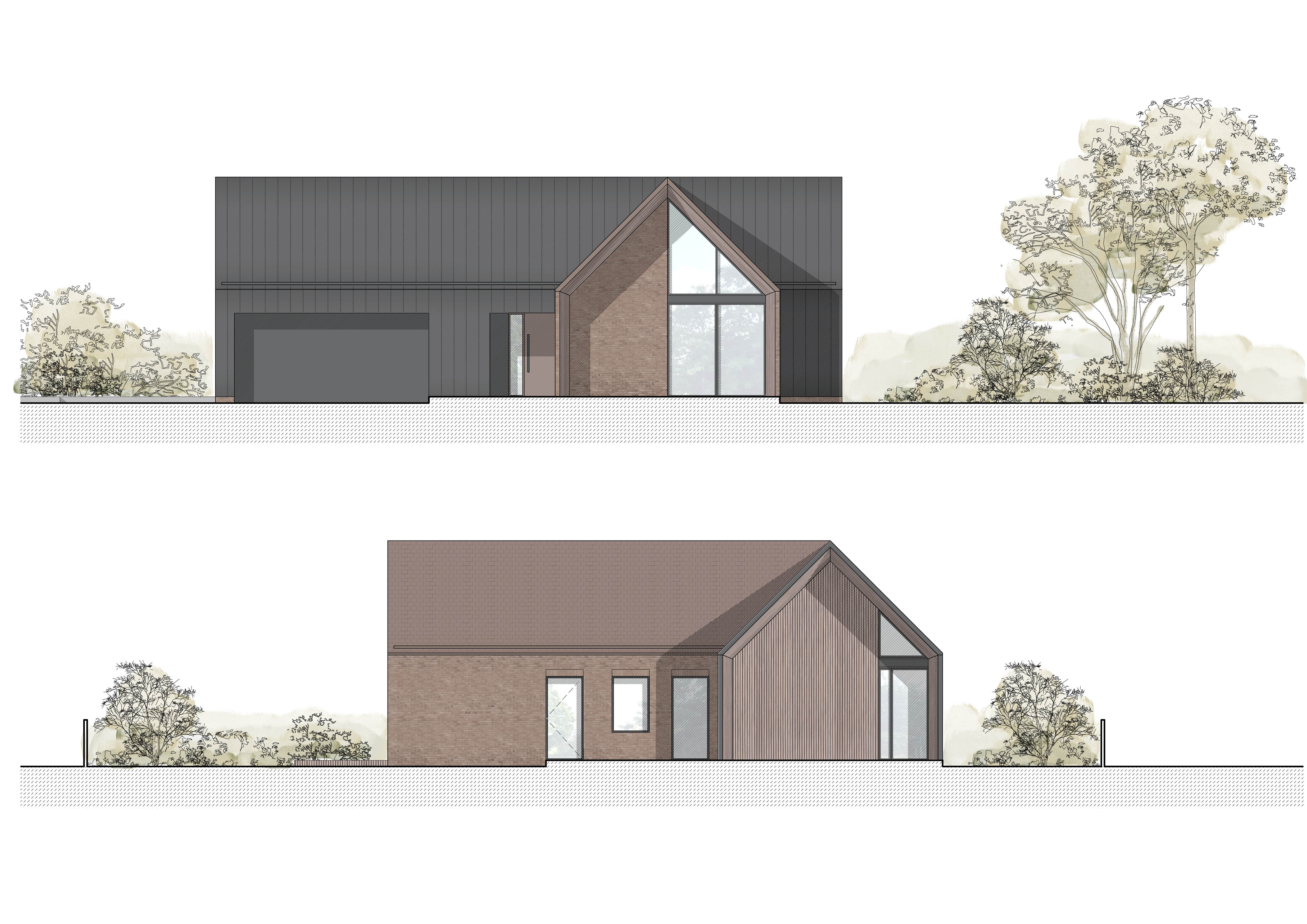 Skrzydło frontowe, zwrócone w stronę drogi, wykończone cegłą i ceramiczną dachówką. Nawiązuje ono do historycznej zabudowy miasta, przywołując jej rzemieślniczy detal i ciepły ton.