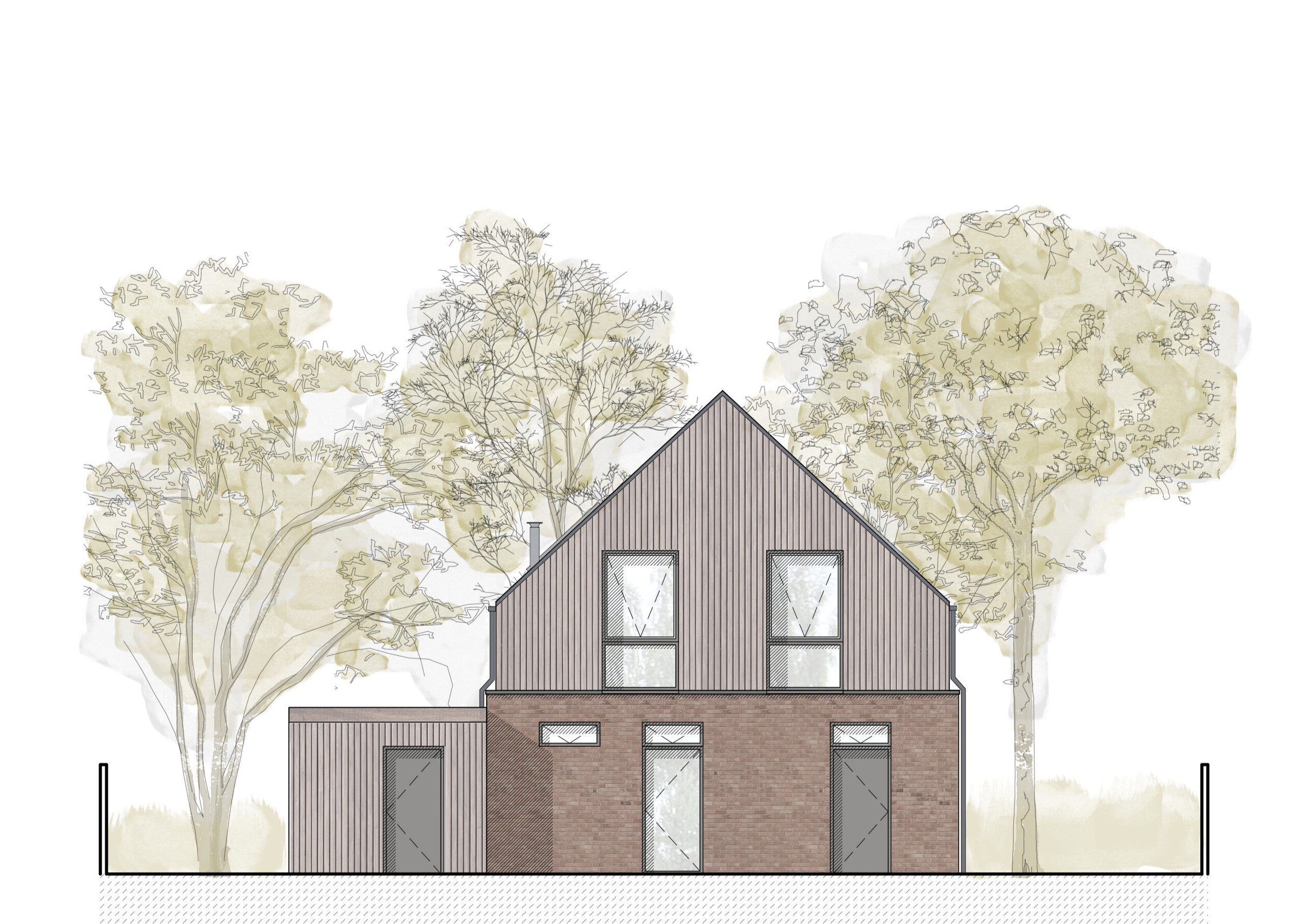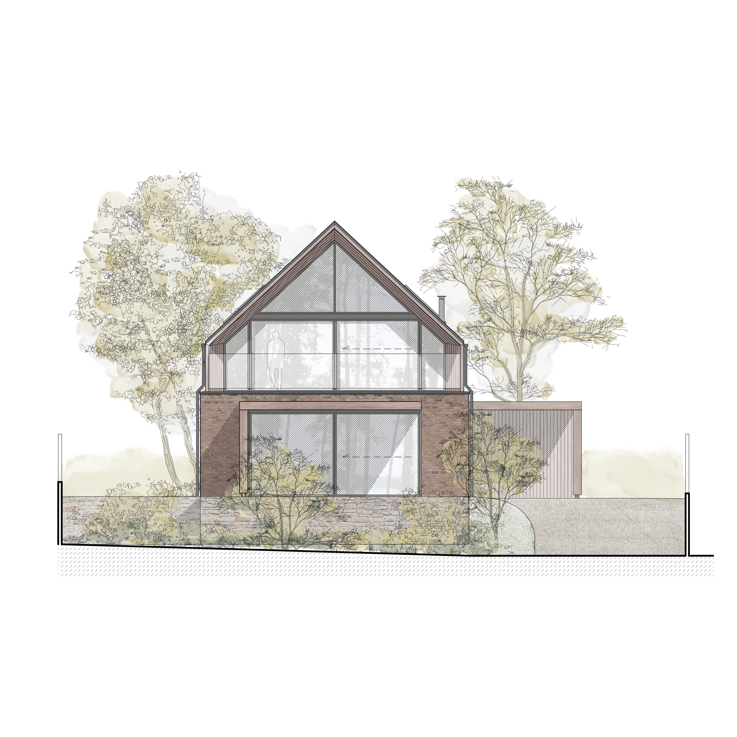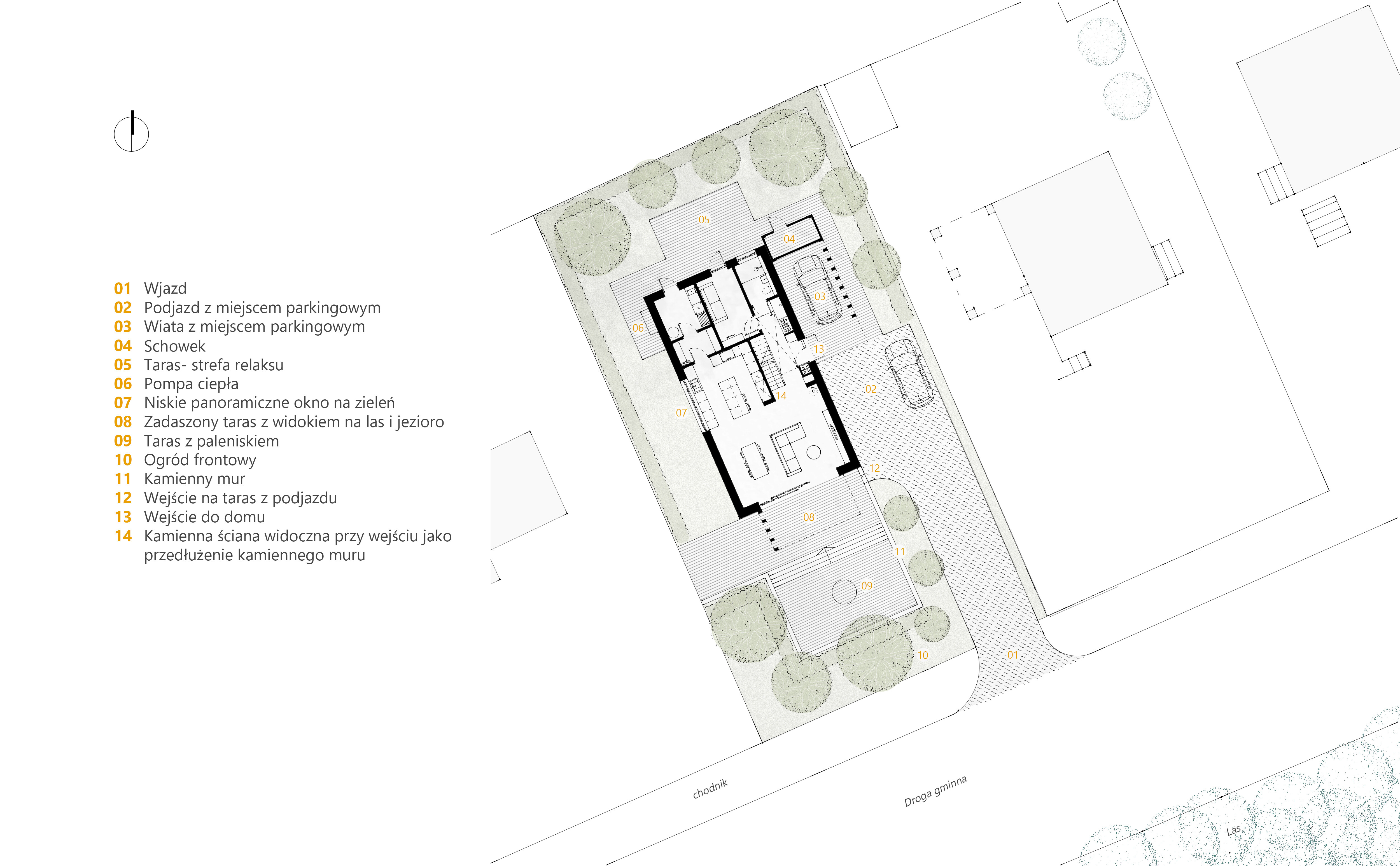 Katedralny dach ze szklaną taflą nawiązuje do dawnych domów letniskowych w formie namiotów, rozsianych niegdyś nad polskimi jeziorami. Stoi on na ceglanej bryle, która przechodzi w kamienny mur wytyczający granice frontowego ogrodu na łagodnej skarpie- będzie to miejsce wspólnych spotkań letnią porą.
