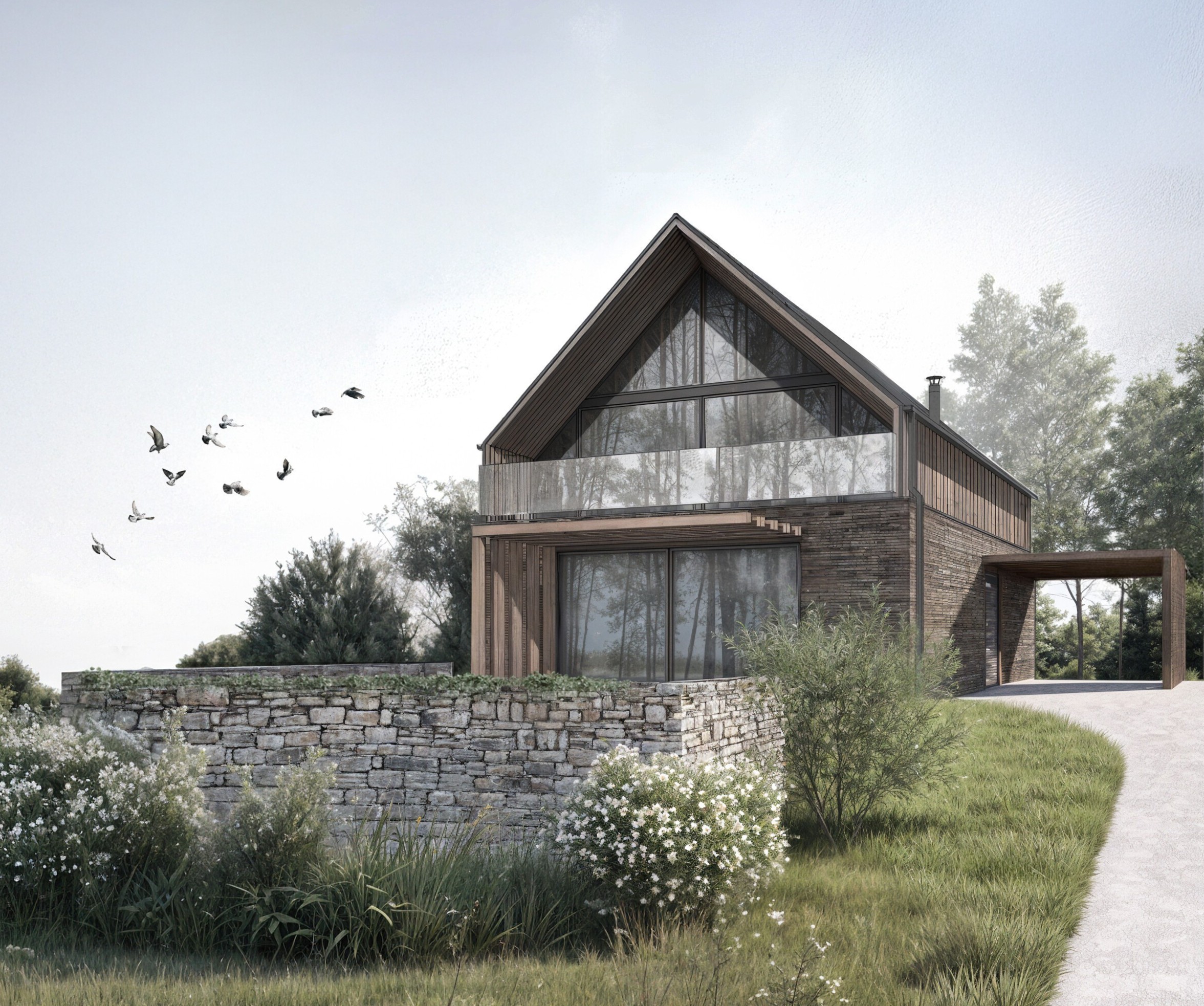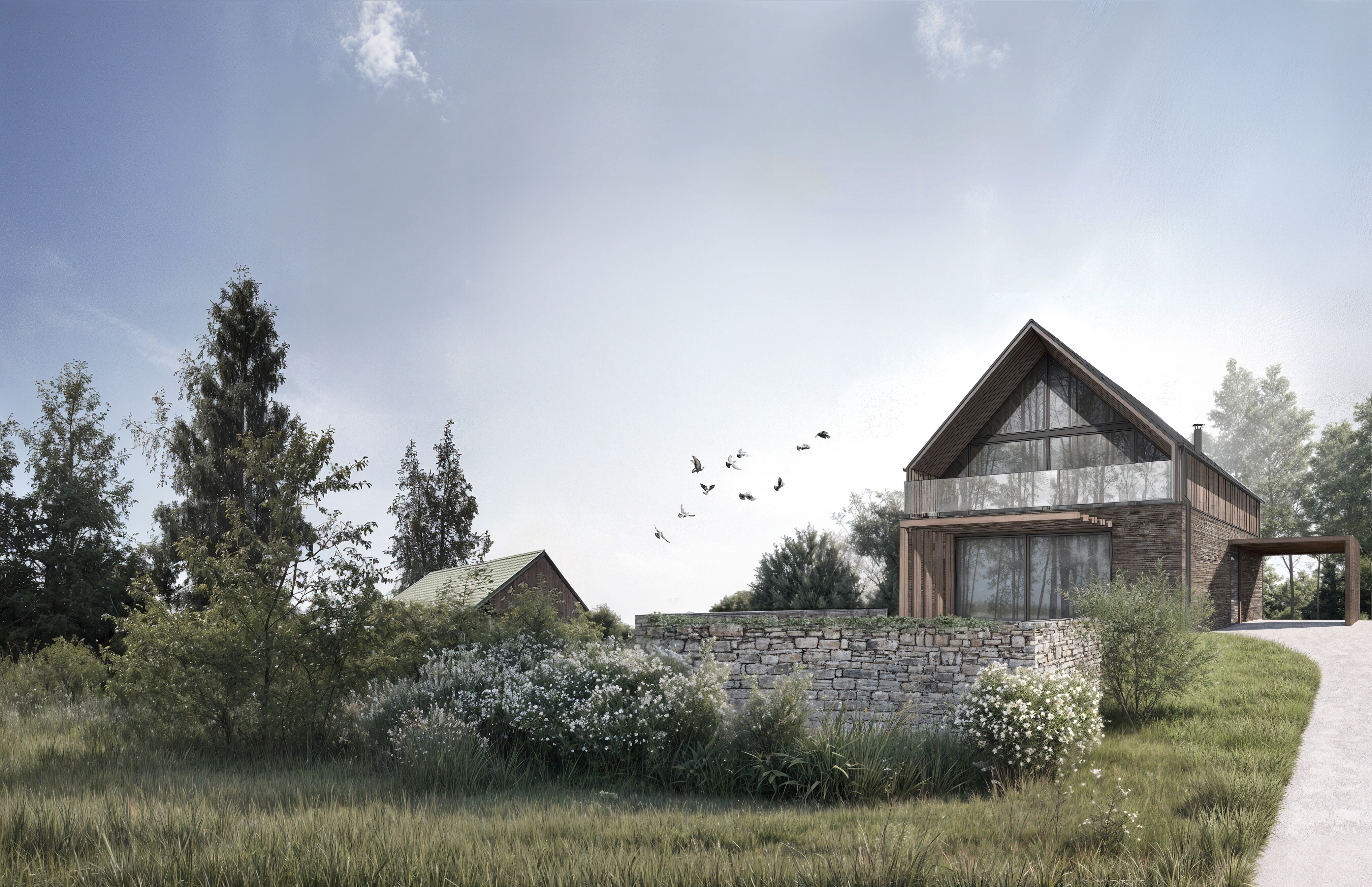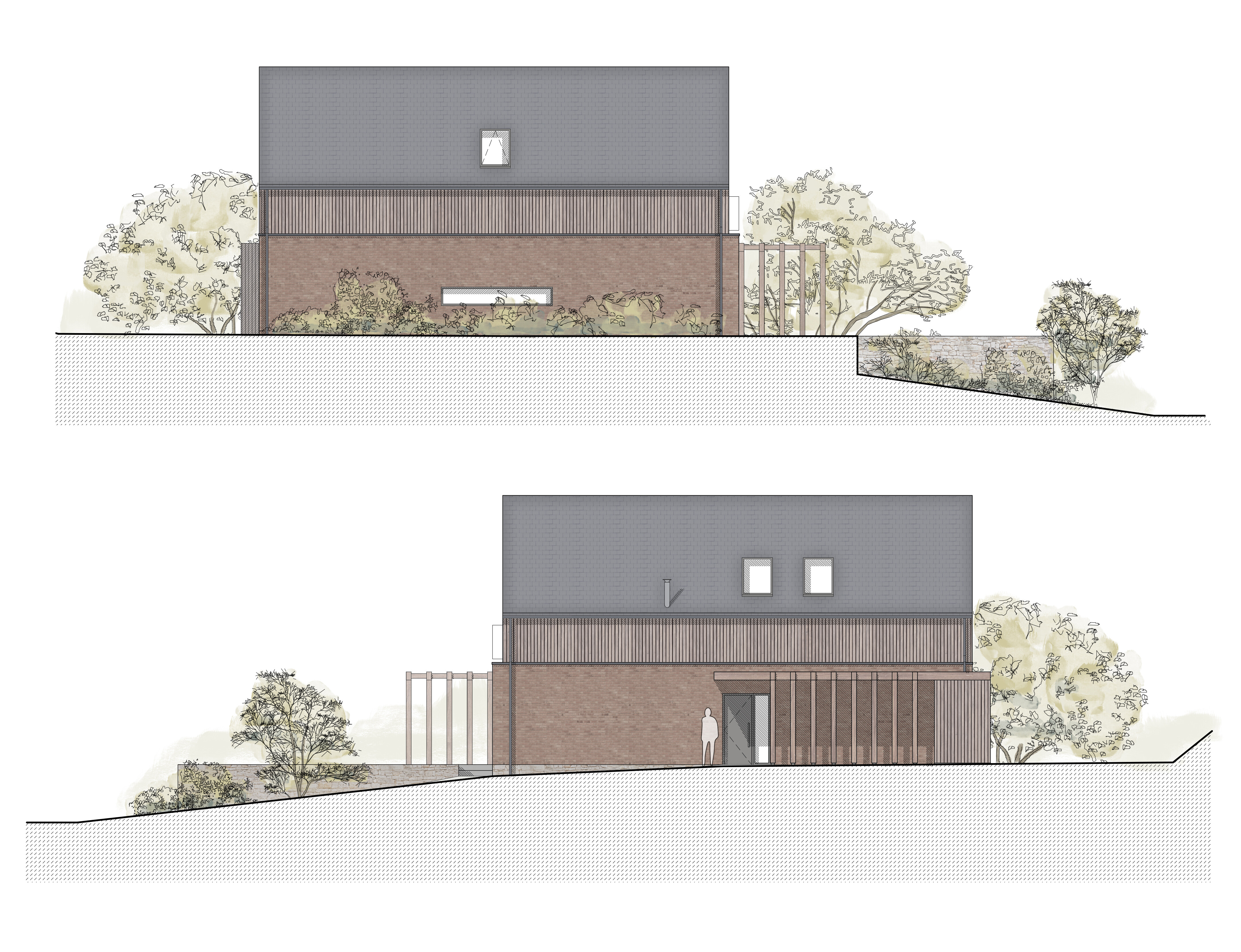 Katedralny dach ze szklaną taflą nawiązuje do dawnych domów letniskowych w formie namiotów, rozsianych niegdyś nad polskimi jeziorami. Stoi on na ceglanej bryle, która przechodzi w kamienny mur wytyczający granice frontowego ogrodu na łagodnej skarpie- będzie to miejsce wspólnych spotkań letnią porą.